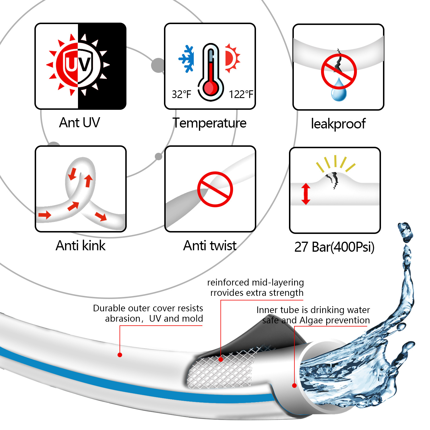 Product Features: Drinking water safe lead free About this item:The perfect hose to have on your next boating or camping trip, the element RV&Marine drinking water hose is equipped for tasks both big and small. Boasting a powerful burst strength , this durable and flexible RV water hose features crush-proof stainless- steel couplings. Water hose is drinking water safe and meets the lead-free standard under the federal Safe Drinking Water Act, as well as California’s strict standards on phthalate content so you can safely use this hose as a potable water supply line.