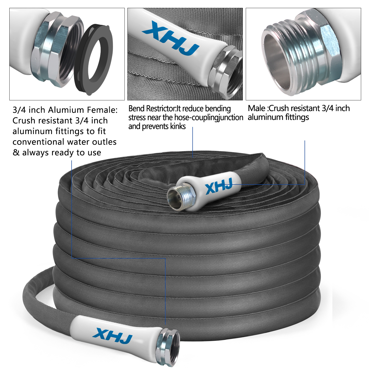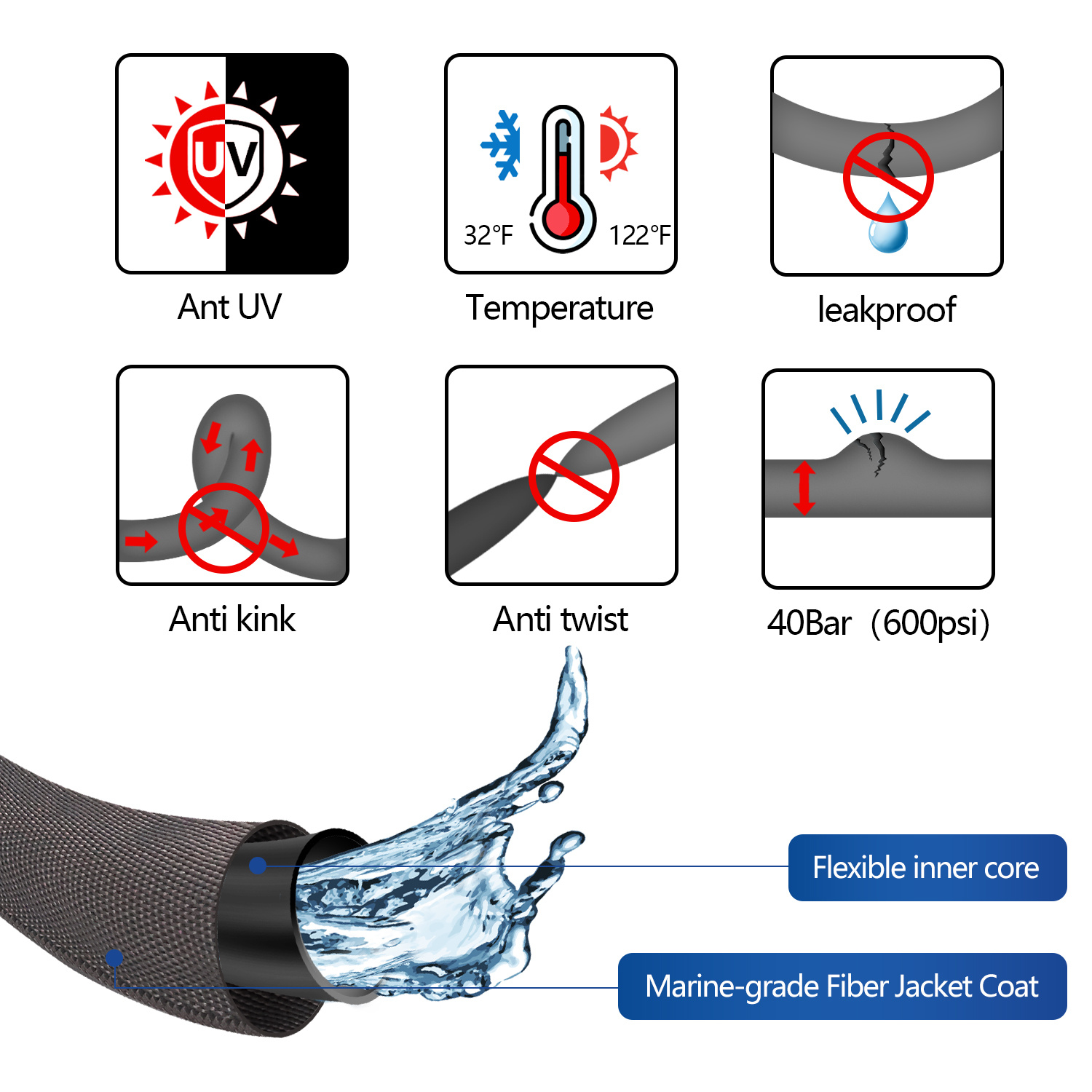 Product Features: Constructed from a rugged, marine grade fiber jacket surrounding a 5/8-inch flexible inner core, the rip and abrasion-resistant fabric is safe on delicate and painted surfaces no scratching, scuffing or snagging! The innovative, dual-layer design is crush-proof and built to withstand the toughest treatment all while maintaining flexibility down to 0 degrees Fahrenheit. Plus, Fiber hose is weather resistant and dries quickly, so you do not have to pick up a heavy, wet or slippery hose. Equipped with durable metal fittings for a solid, leak-proof connection, Fiber hose is kink-free, twist- and tangle-free for uninterrupted flow when watering your yard or garden. BPA-free, Lead-free and Phthalate-free, Fiber hose is up to 50% lighter than conventional hoses, and provides maximum durability plus performance, and coils easily for compact storage.Fiber hose comes in a variety of convenient lengths to fit any size lawn, auto, boat, garden and more!