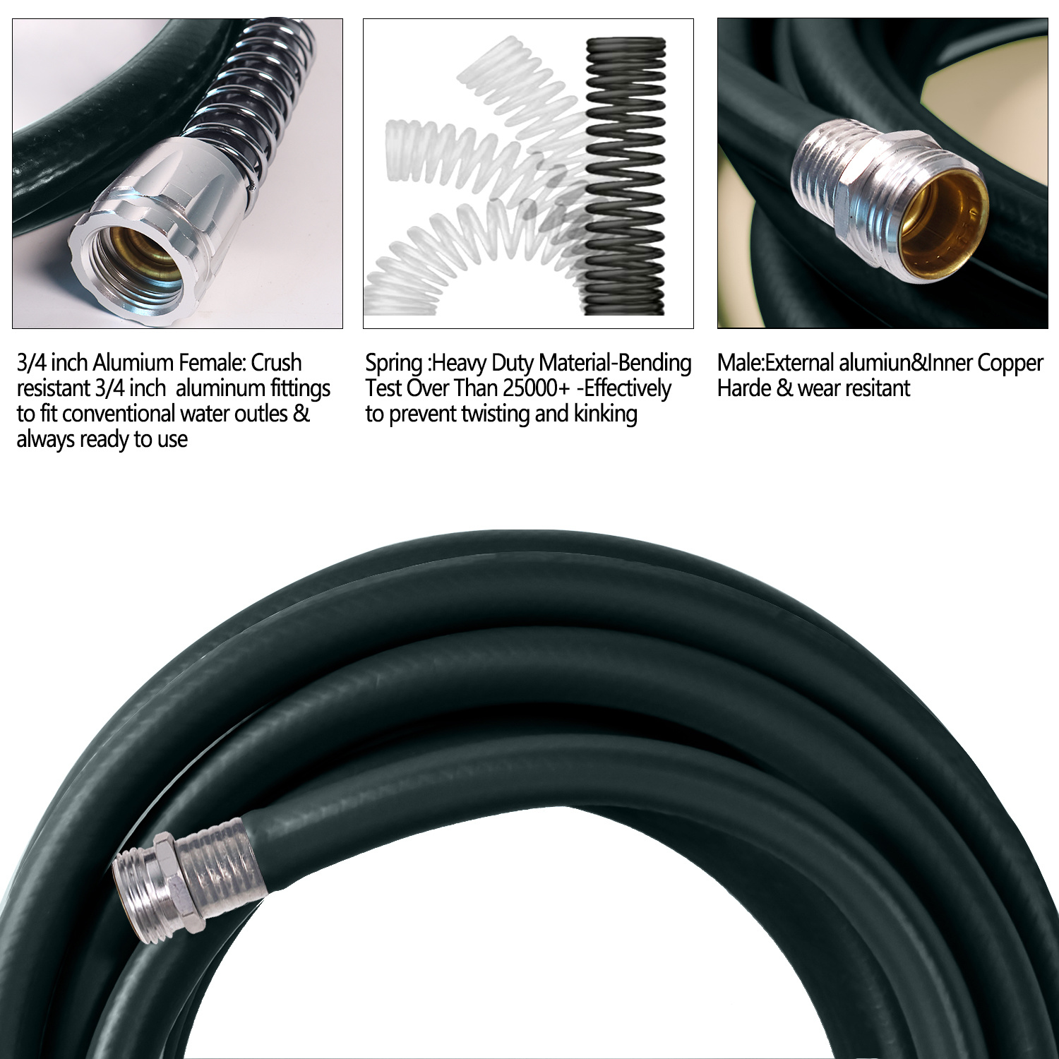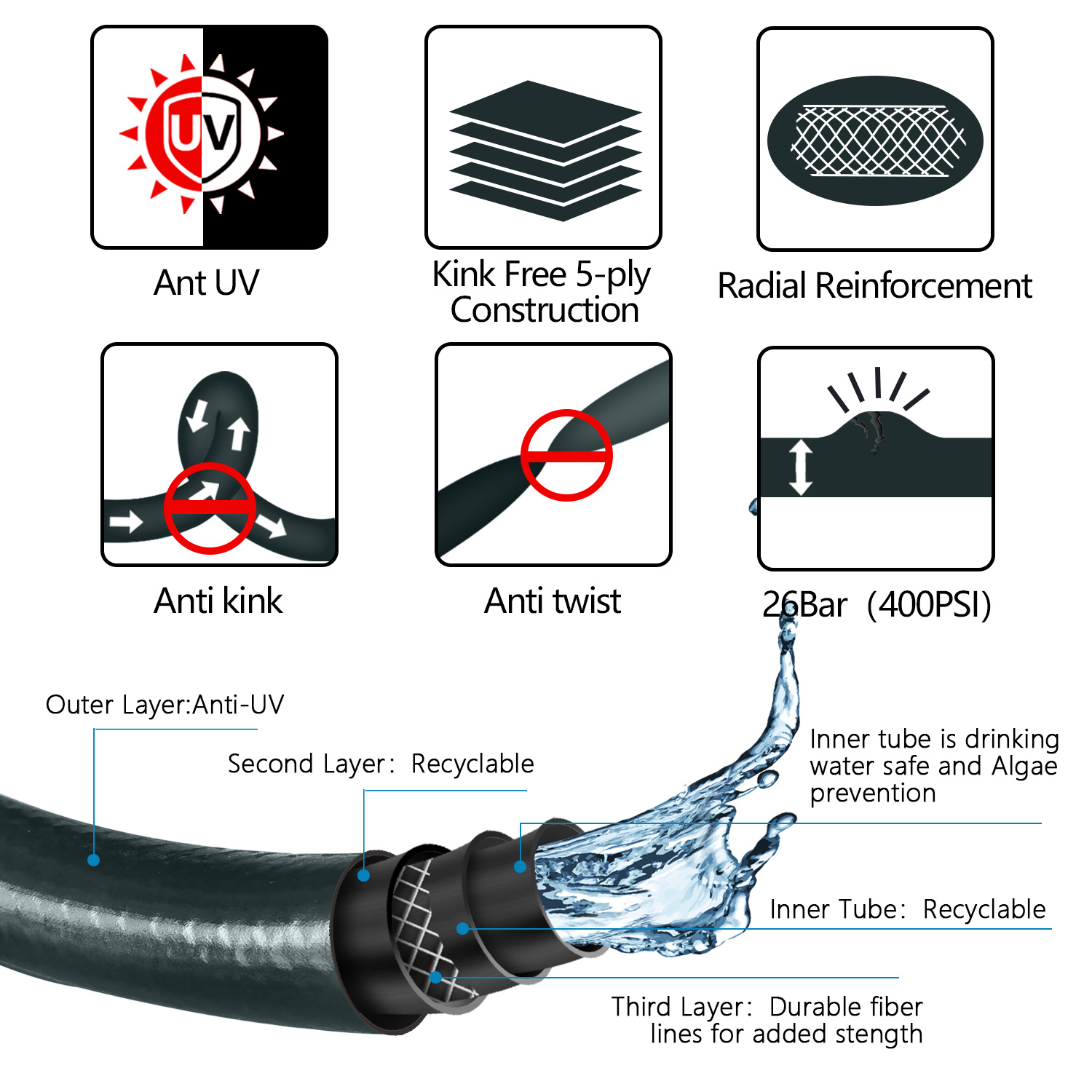 Product Features: It is burst rated for up to 500 PSI and resistant to temperature, crushing, and abrasion. This hose is perfect for watering the flowers, washing the car, rinsing patio furniture or connecting to a lawn sprinkler.