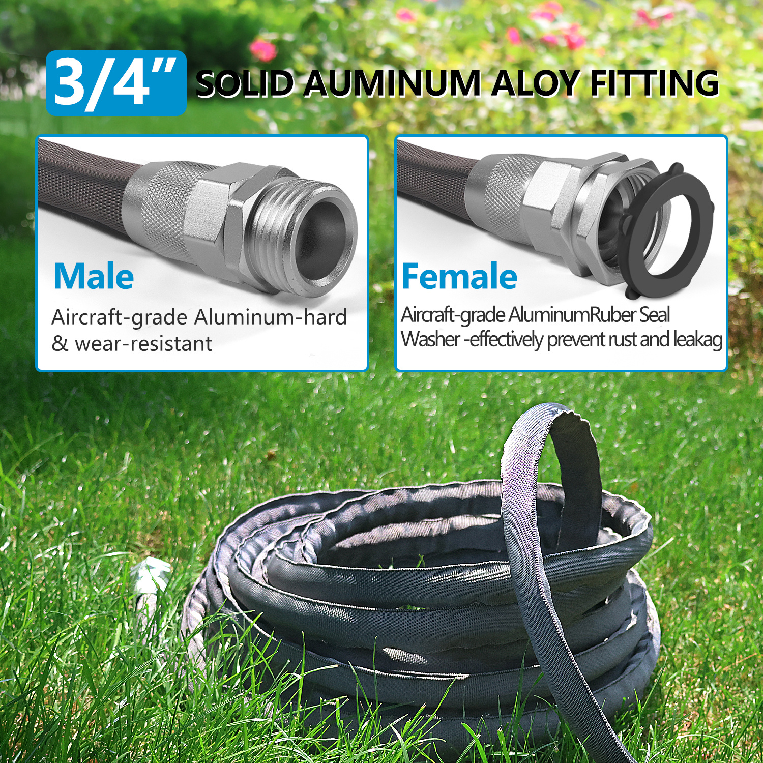 Product Features: Constructed from a rugged, marine grade fiber jacket surrounding a 5/8-inch flexible inner core, the rip and abrasion-resistant fabric is safe on delicate and painted surfaces no scratching, scuffing or snagging! The innovative, dual-layer design is crush-proof and built to withstand the toughest treatment all while maintaining flexibility down to 0 degrees Fahrenheit. Plus, Fiber hose is weather resistant and dries quickly, so you do not have to pick up a heavy, wet or slippery hose. Equipped with durable metal fittings for a solid, leak-proof connection, Fiber hose is kink-free, twist- and tangle-free for uninterrupted flow when watering your yard or garden. BPA-free, Lead-free and Phthalate-free, Fiber hose is up to 50% lighter than conventional hoses, and provides maximum durability plus performance, and coils easily for compact storage.Fiber hose comes in a variety of convenient lengths to fit any size lawn, auto, boat, garden and more!