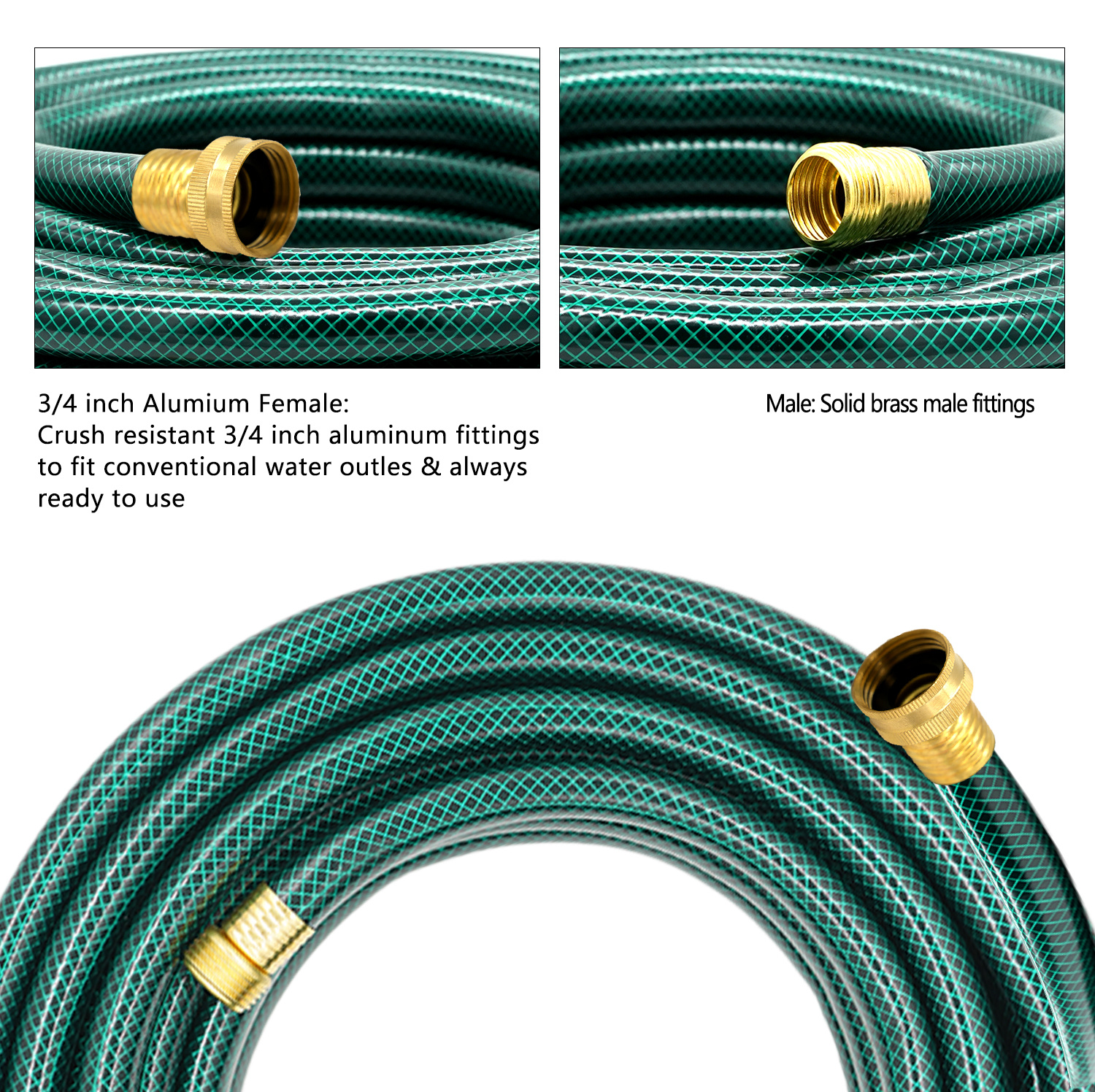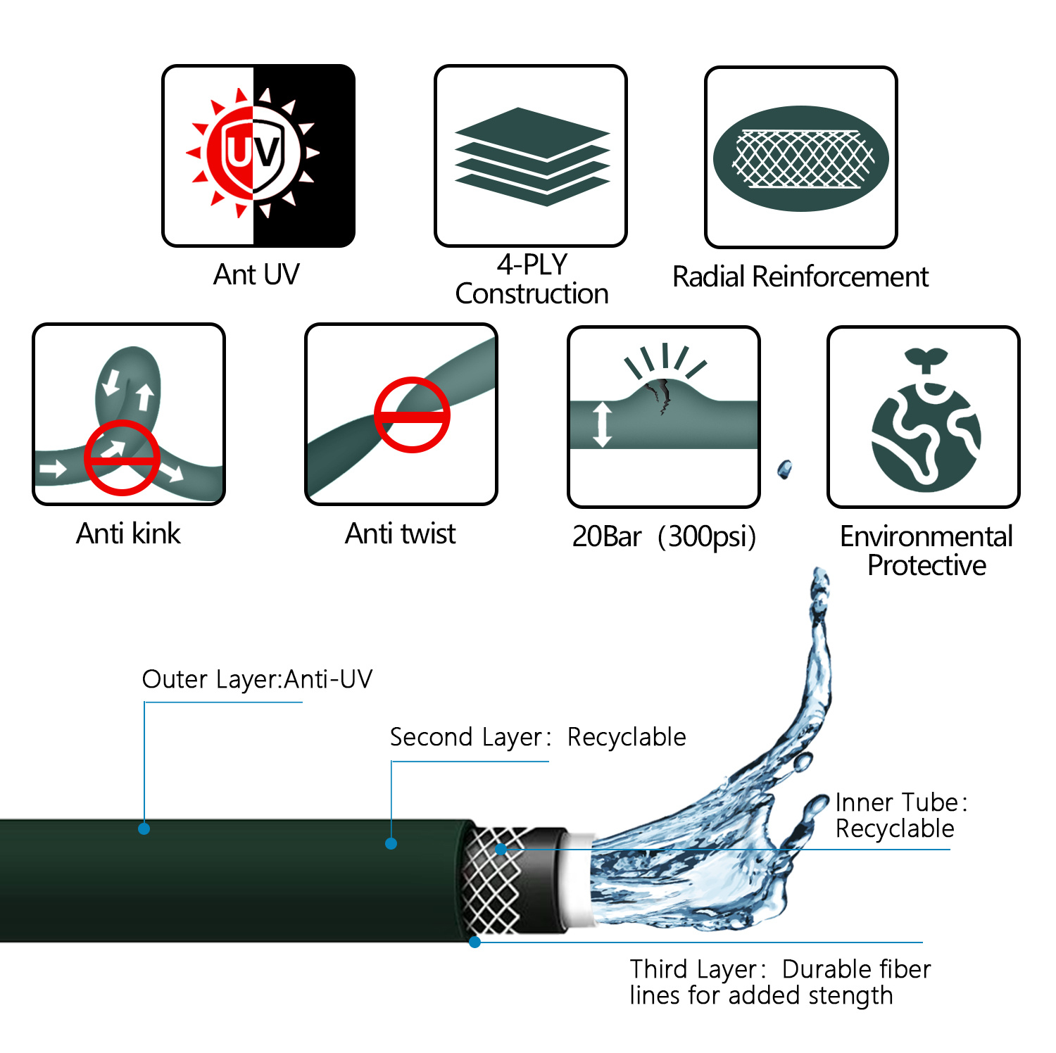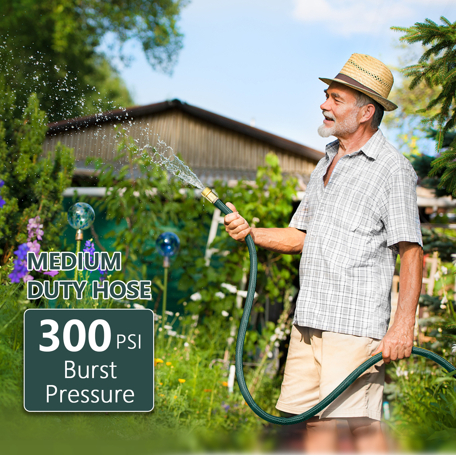 Product Features: Medium duty garden hose is a garden hose ideal for all year, medium duty use at home. Constructed with a hose armor, this garden hose has the ability to stay flexible year-round during all temperatures and allow you to use hose without adjusting and backtracking. Hose armor is kink-resistant and comes with a collar guard that prevents kinking at the spigot. Knit reinforcement in key areas allows for 300 PSI burst strength and continues flowing steady pressure water with solid brass, lead free couplings.