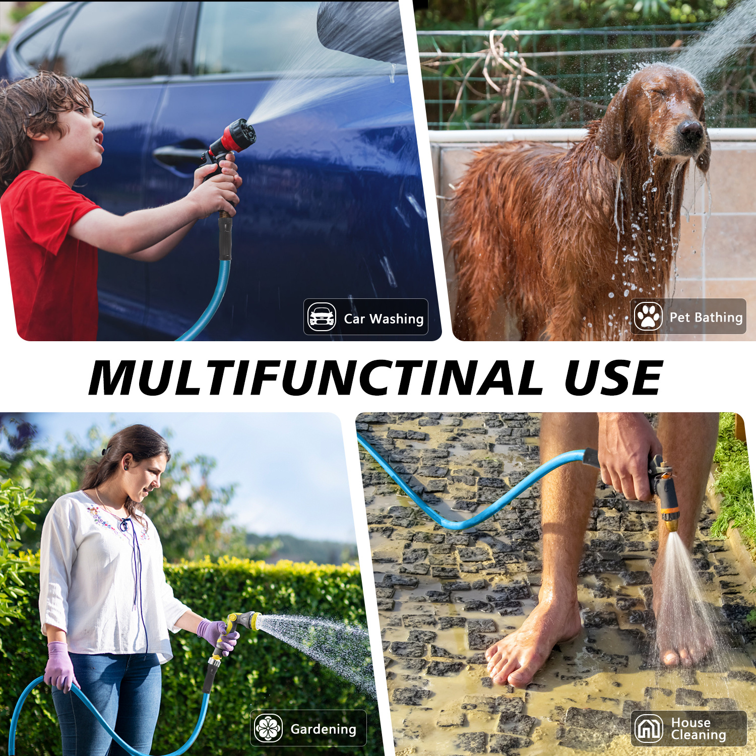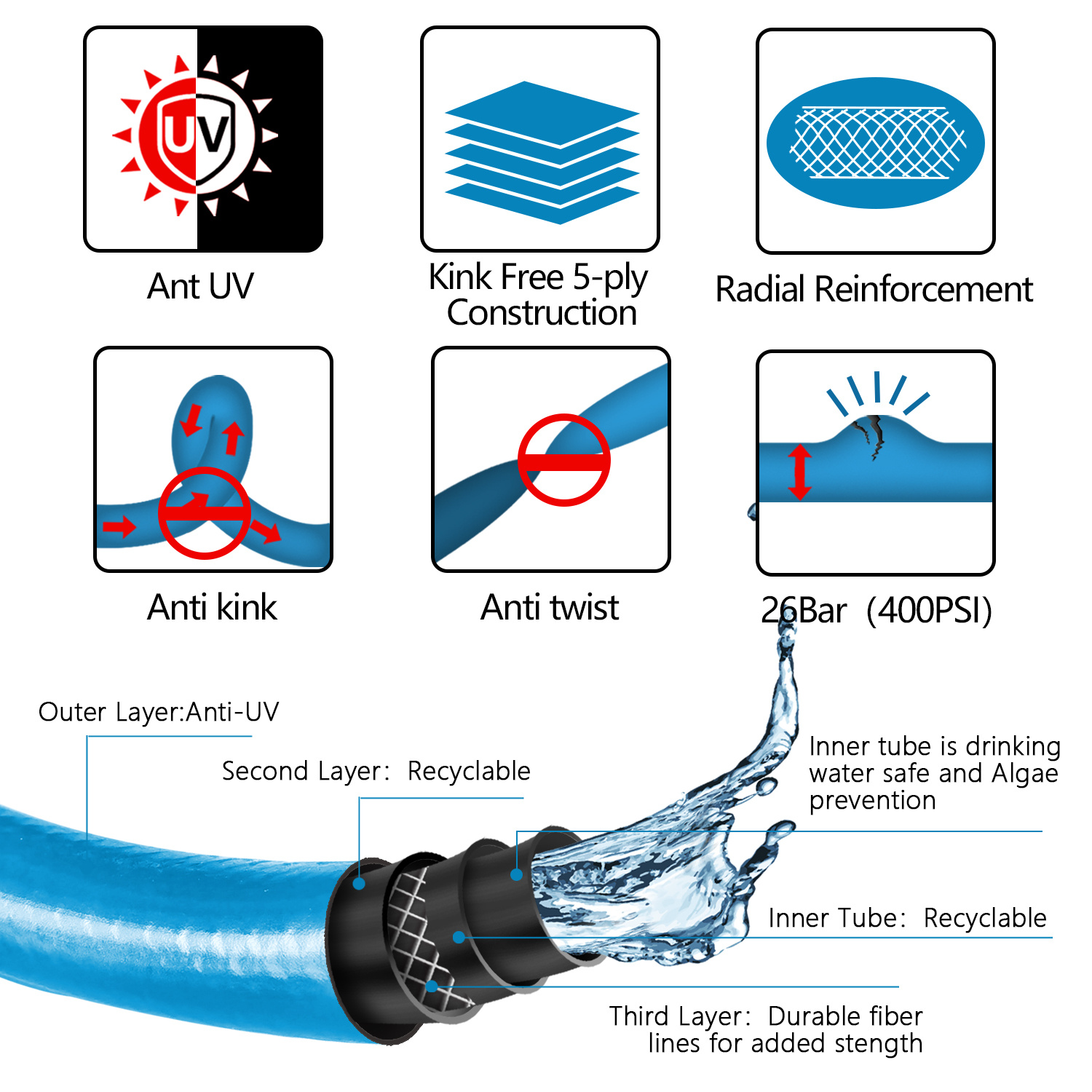 Product Features: It is burst rated for up to 500 PSI and resistant to temperature, crushing, and abrasion. This hose is perfect for watering the flowers, washing the car, rinsing patio furniture or connecting to a lawn sprinkler.