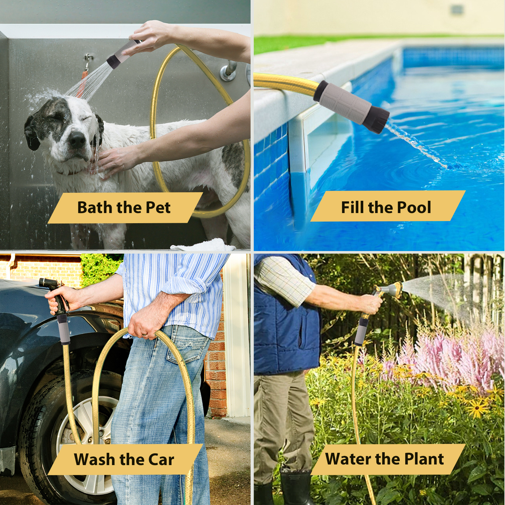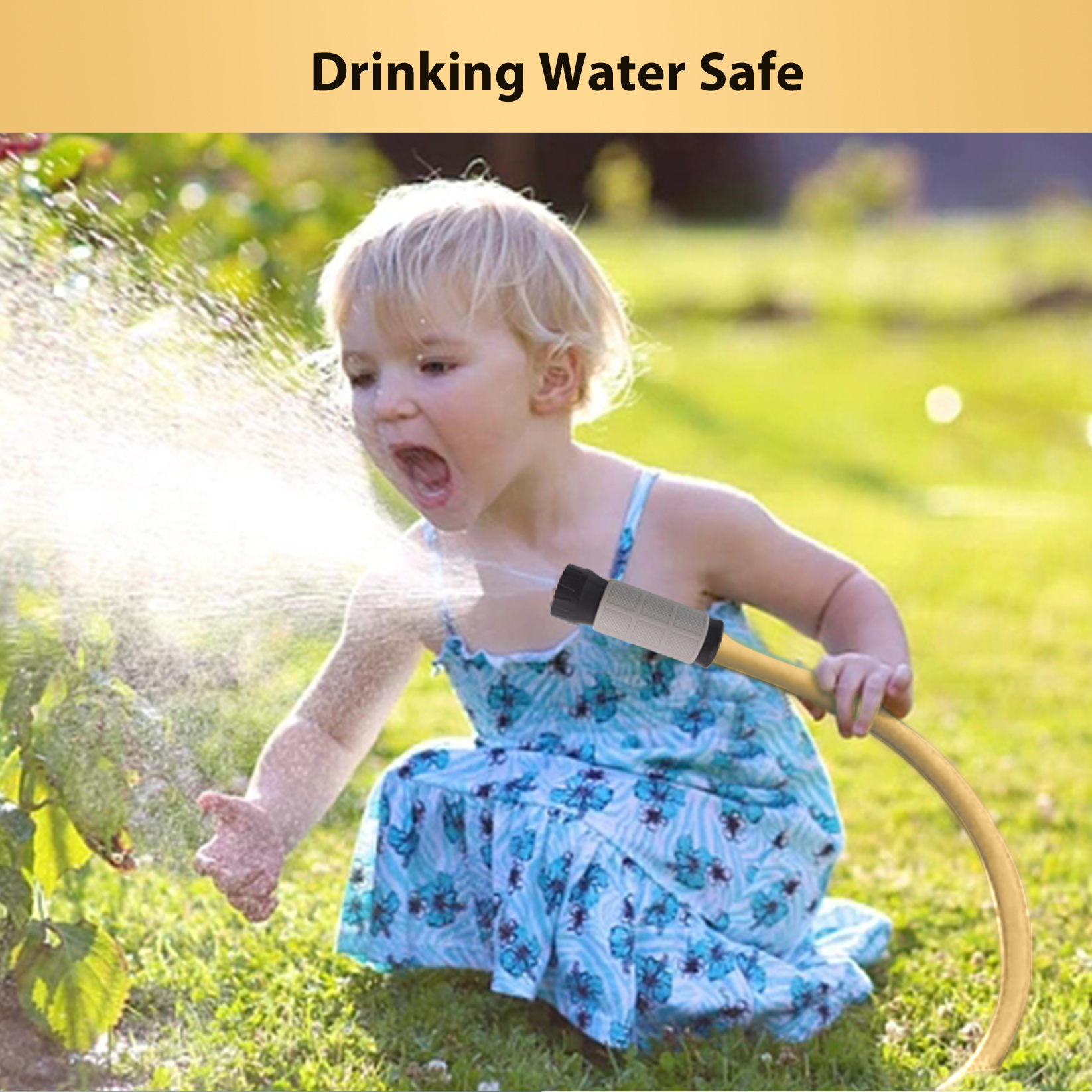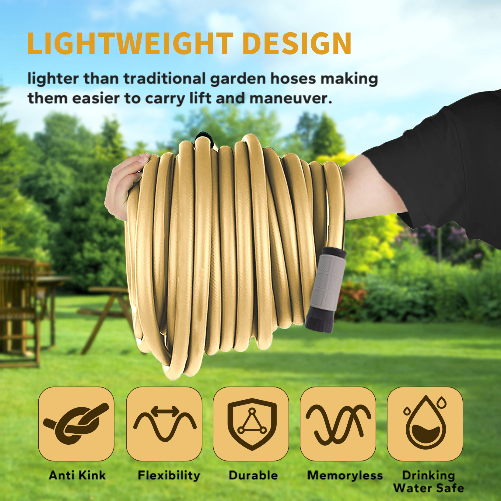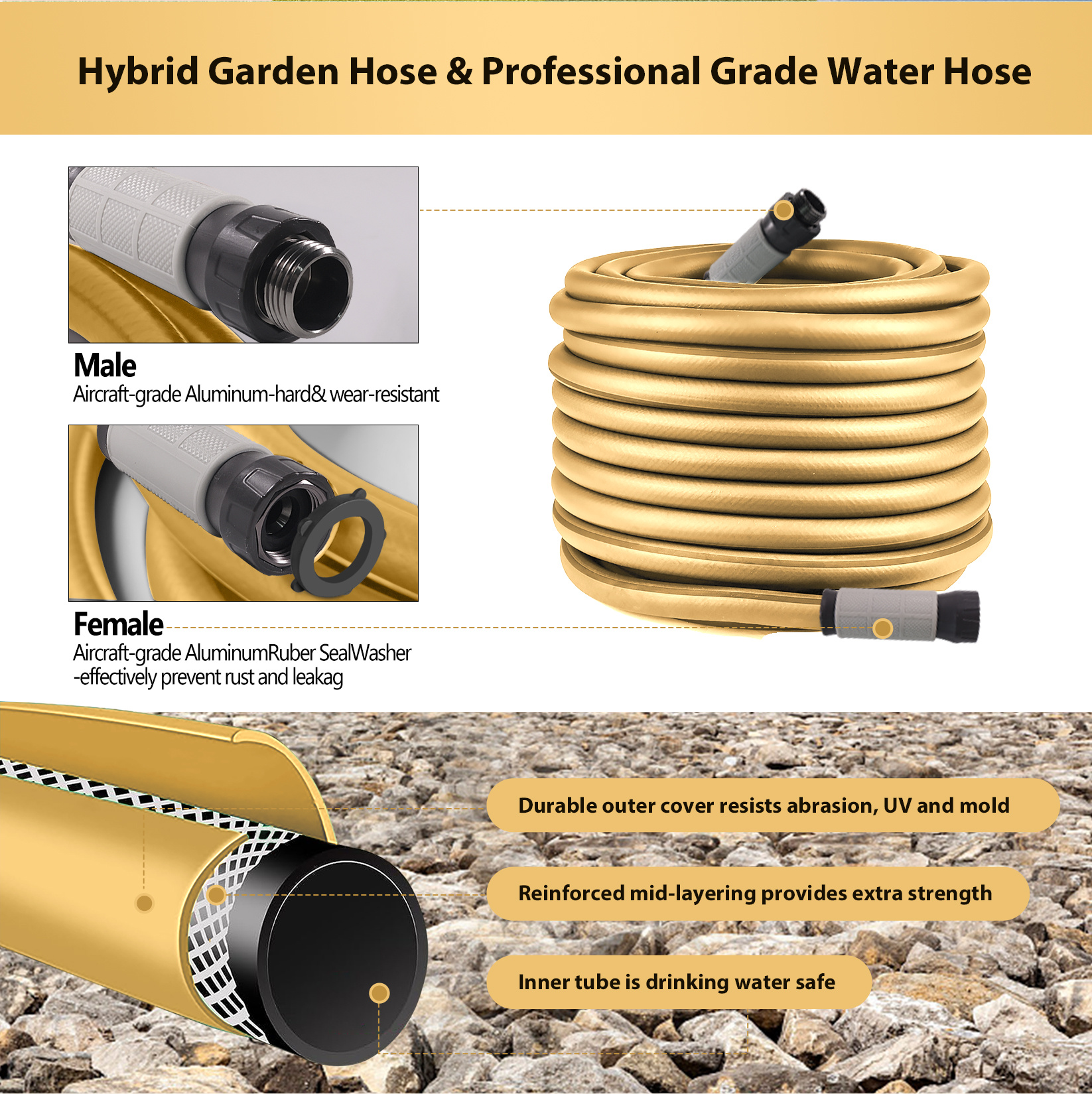 Product Features: Male & female swivel grip - easily connects to spigots and attachments. The swivel action ensures that either end can be easily attached and the hose extended without twisting, so sprinklers lie flat and your work is more efficient. Technology - combines Polyurethane and PVC, making the hose easy to maneuver around trees, bushes or other obstacles. Forged aluminum titanium coated couplings - lead free and crush proof Anti-kink technology - won't kink under pressure and has zero memory. Unmatched quality - abrasion resistant outer cover and crush resistant titanium coated forged aluminum fittings, with a 500 psi Burst strength. Hybrid Water Hose is the first hose on the market to feature advanced technologies to make your work outdoors easier. The PolyFusion technology combines Polyurethane and PVC, making the hose lightweight and easy to work with, while the AntiKink technology provides extreme elasticity, to keep kinking at a minimum. This hose is scratch and abrasion resistant and will maintain its flexibility in -15 degree weather